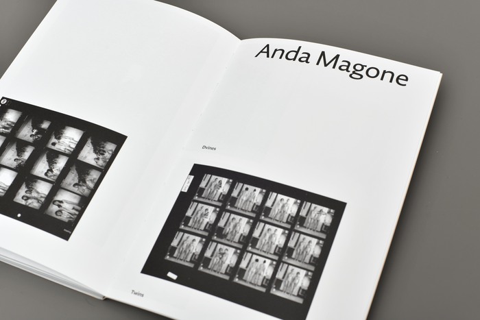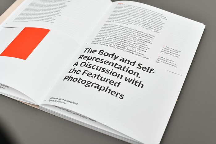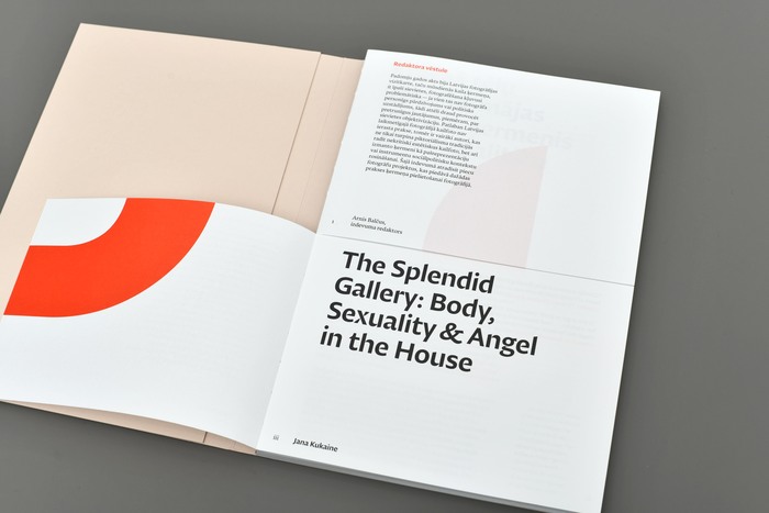This bilingual yearbook showcases contemporary Latvian photographers and significant exhibitions at the Latvian Museum of Photography in Riga. Designer Alexey Murashko selected three typefaces by Nikola Djurek for the book: Diurnal Display for the titles, Nocturno for the main text, and Diurnal for the marginalia. The book is cut horizontally in half, with the lower part containing the English text and the top part containing the Latvian text. This system allows the pages to be flipped independently and creates unexpected compositions.