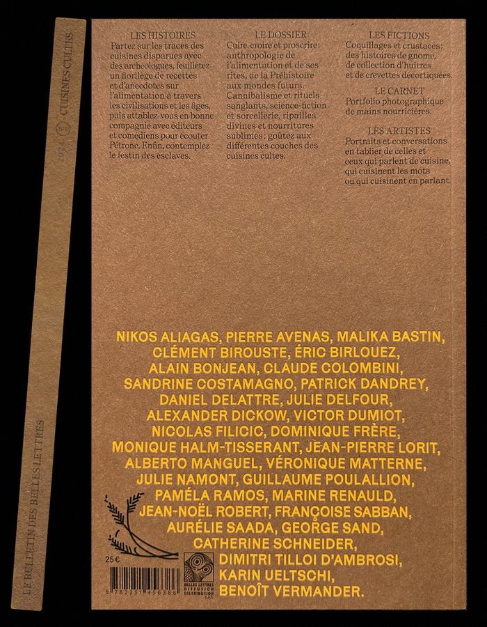 “Cuisines Cultes”, or “Cult Cuisine“ in English, is the fifth issue of the book-like magazine by French publisher Les Belles Lettres. It is dedicated to the rituals associated with food, from the prehistoric age to the future. It is filled with articles, recipes, photographies, short stories, and so on.