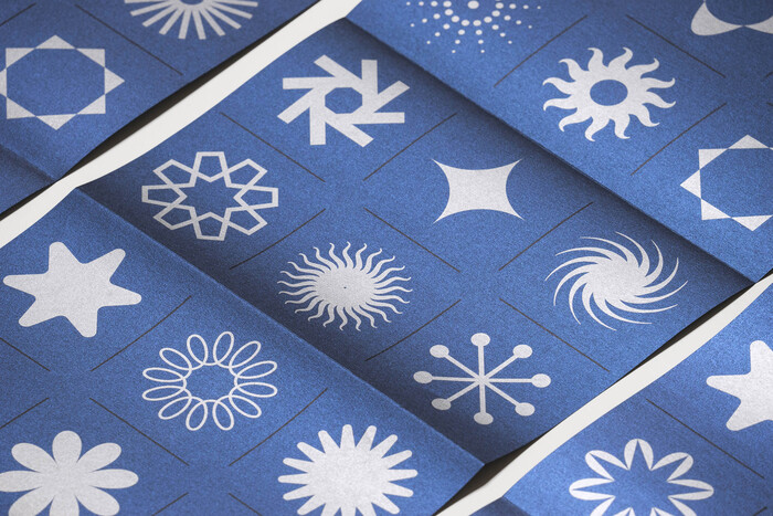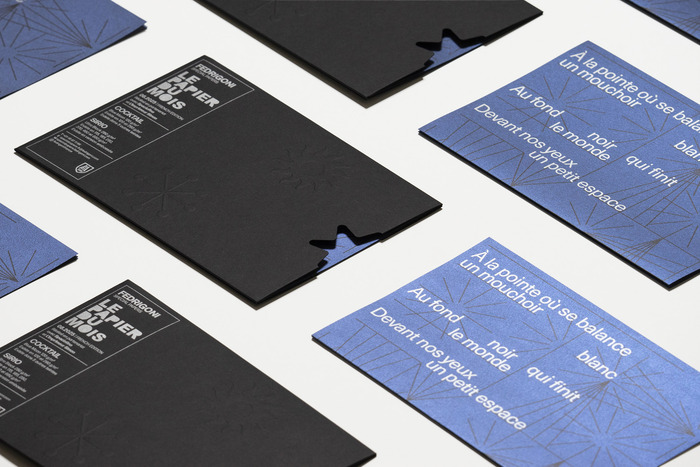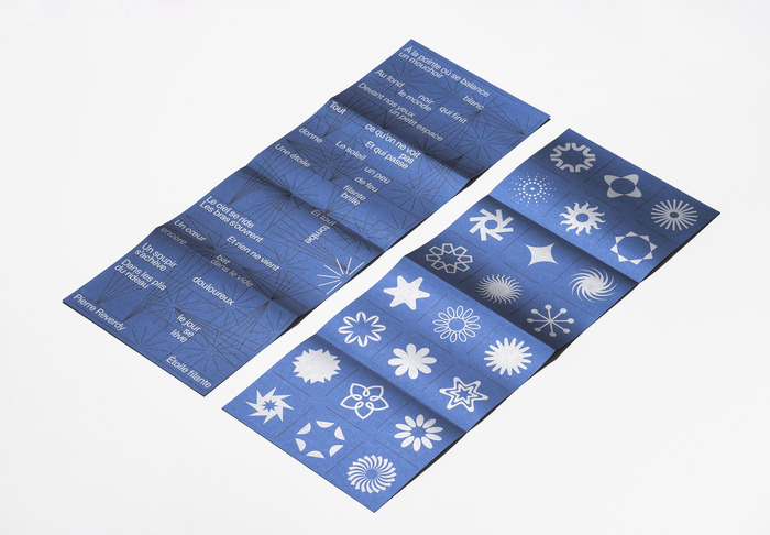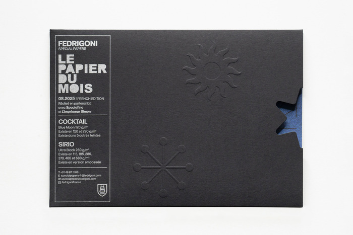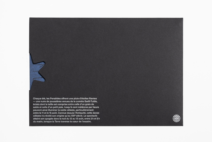 Les Perséides / Le Papier du Mois is a collaboration between Fedrigoni, Spaciofino and L’imprimeur Simon. Every month, Fedrigoni organises a collaboration between a design studio and a printer to showcase their range of papers. Responsible for the August 2025 edition, Spaciofino took inspiration from the Perseids, a meteor shower that occurs every summer. The result is a leporello – measuring 560×205 mm an printed on Cocktail Blue Moon 120 gm² paper, contained in a pocket revealing a poem by Pierre Reverdy, “Étoile filante” (Shooting star). On the back, the studio has drawn a star collection reminiscent of a naturalist’s board.