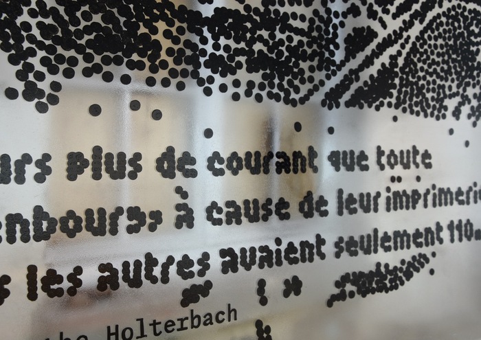 I highlighted the former Geistel printing house through four archive photos redrawn in dotted lines. The installation, intended for local residents, combines testimonials and images to revive memories of the place. The drawings on Plexiglas are superimposed on the printing house, inviting a sensitive and participatory reinterpretation of history. Each panel explores a theme (family, lithography, workers), supported by typography that evokes a memory in motion.