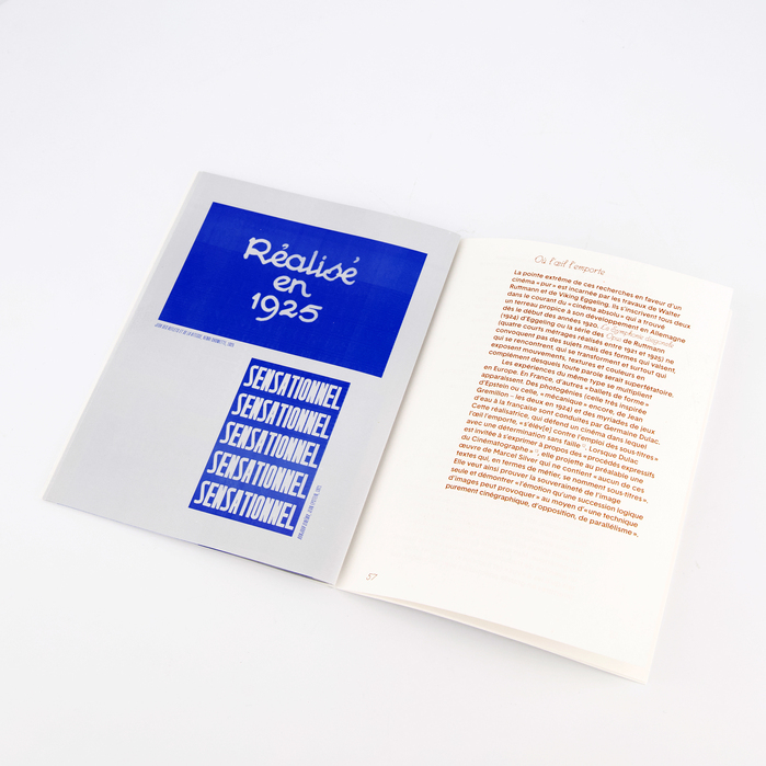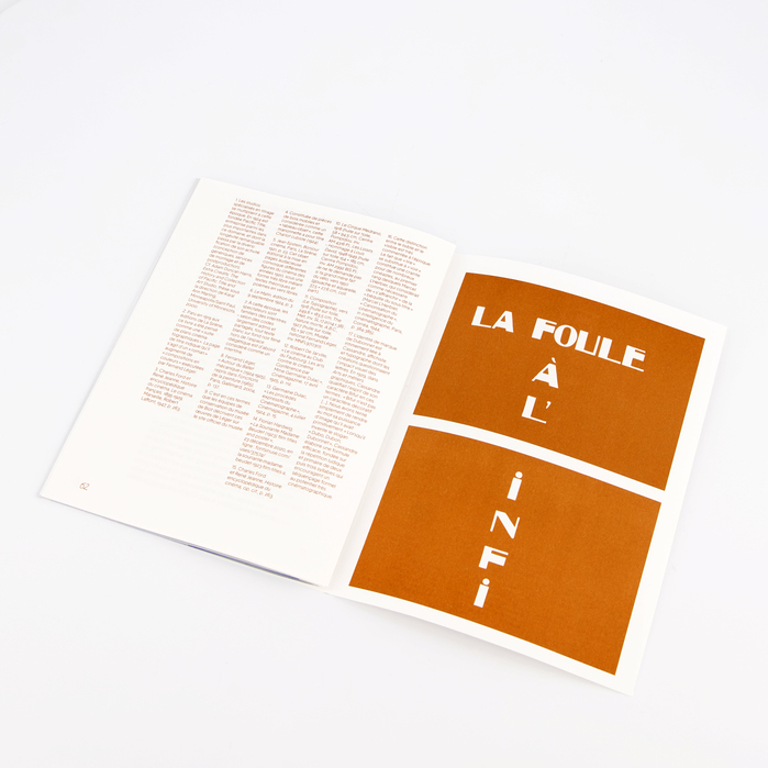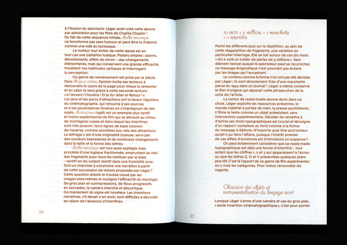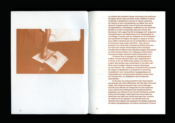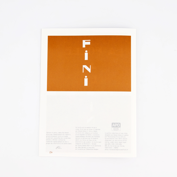 This is the fourth issue of La petite collection, designed by Bureau Roman Seban. As with every issue, the number is printed on the cover and the colophon on the back cover, typeset in Bertin (here in Square style), the body text is set in Basetica, the captions in Muoto, all available from 205TF. The film titles and subheadings that punctuate the text are set in Nosferatu.