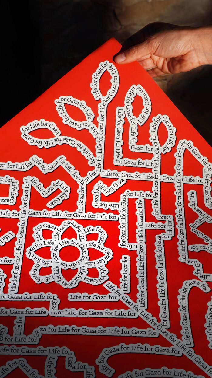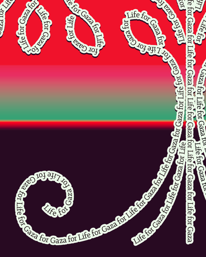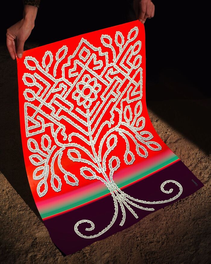 The composition centers on a tree of life constructed through language. Words are woven into form, spelling out a single, unequivocal message: Life for Gaza. Drawing from Palestinian tatreez, the piece reinterprets this ancestral embroidery as a contemporary graphic system, where repetition functions as an act of remembrance and resistance.