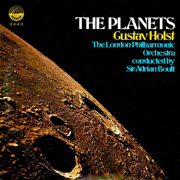 Here it can be seen in use for a recording of Gustav Holst’s The Planets, sandwiched between two unrelated pieces by Sibelius, and reissued in 1971 by British budget label Golden Hours. The cover photo is a stock moonscape from NASA. The Moon isn’t a planet, of course, but then again, budgets are budgets.