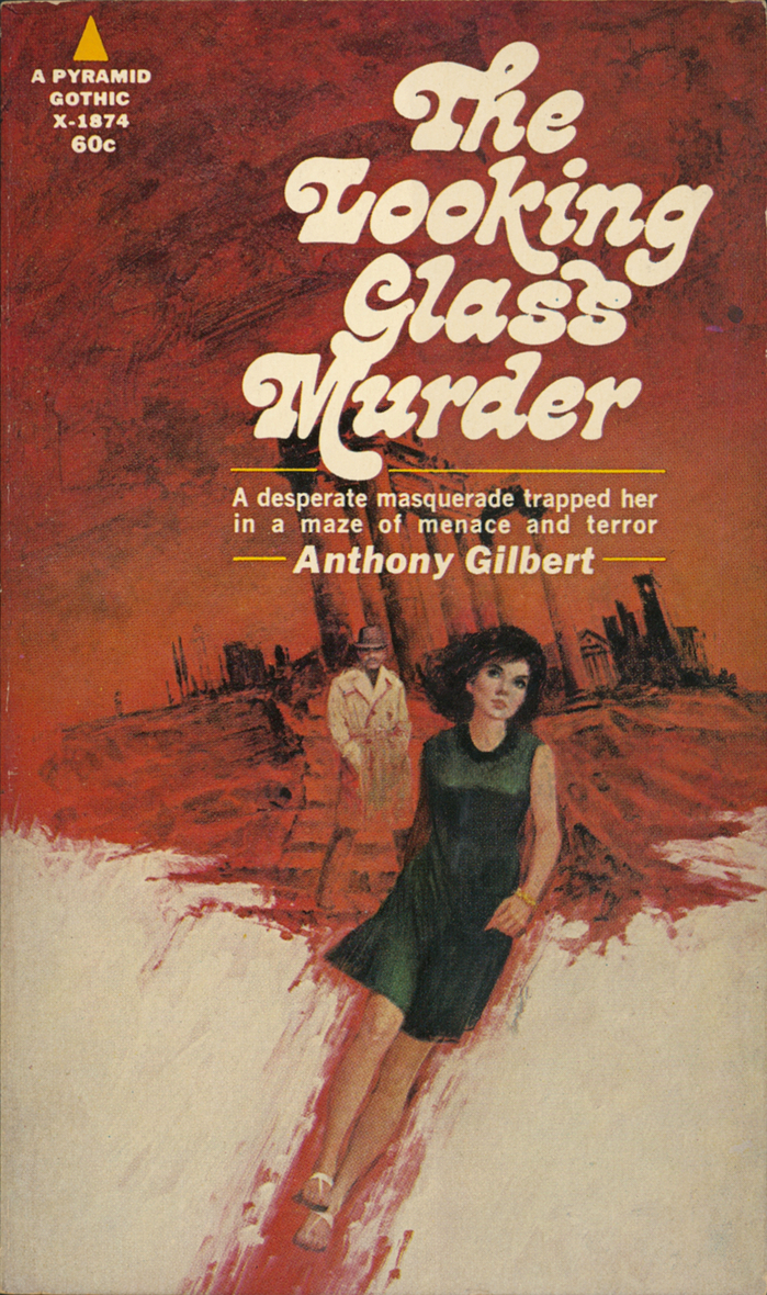The Looking Glass Murder is book #44 in the Arthur Crook series by Anthony Gilbert, the pen name of British writer Lucy Beatrice Malleson (1899–1973). First published in 1966, this is the cover of Pyramid Gothic’s paperback edition from 1968, with cover art by Lou Marchetti (1920–1992). The title typeface is the bold weight of West Cooper Nouveau Swash.
