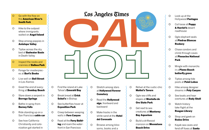 The 101 Best California Experiences is a guide to the most awe-inspiring, fascinating and delightful things to do across the Golden State — right now in 2023. Stargaze in Borrego Springs. See the shoreline sparkle at Glass Beach. Eat with abandon at Grand Central Market. Written by L.A. Times travel writer Christopher Reynolds, “Cal 101” is packed with history, insider tips, traveler updates and a checklist to mark off your adventures.