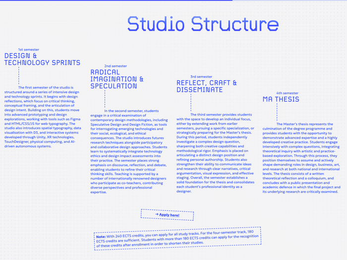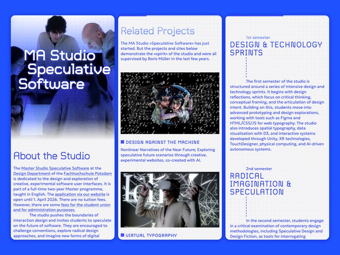 The Master Studio Speculative Software at the Design Department of the Fachhochschule Potsdam is dedicated to the design and exploration of creative, experimental software user interfaces. It is part of a full-time two-year Master’s programme, taught in English.