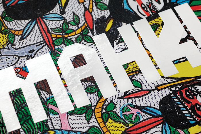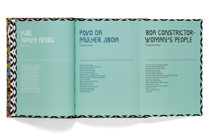 Graphic motifs inspired by the skin of the boa constrictor—a central theme in the group’s songs, paintings, and drawings—run throughout many of the works and were adapted into a geometric pattern framing every page of the book. The title on the cover is printed in glossy screen printing, using the geometric typeface Tokyto. This font’s design, also used for the artwork titles and section openings, is composed exclusively of diagonals and steps, without curves, referencing the graphic motifs presented throughout the catalog.