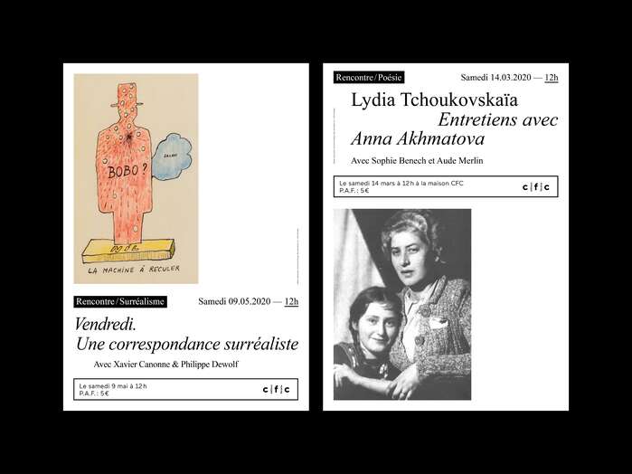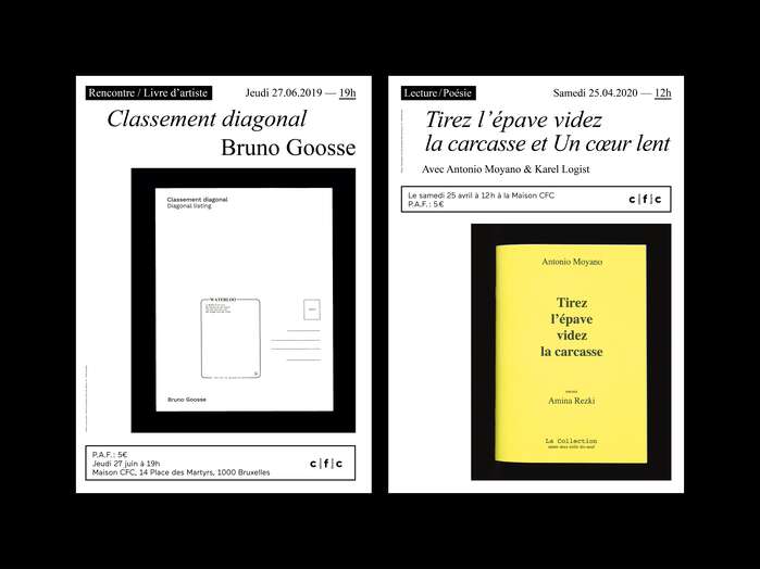 Visual identity of the quarterly booklet, the quarterly program posters and the posters for all events for Maison CFC, a bookstore in Brussels, Belgium.