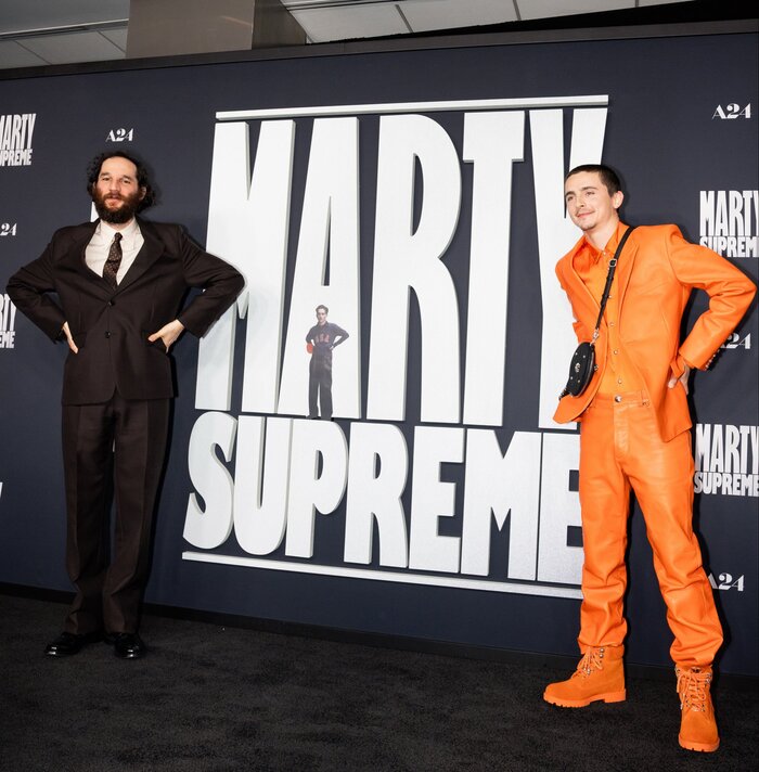 Timothée and Josh Safdie imitating the Marty Mauser pose at the Marty Supreme black carpet in Los Angeles.