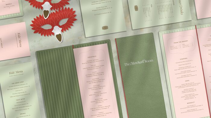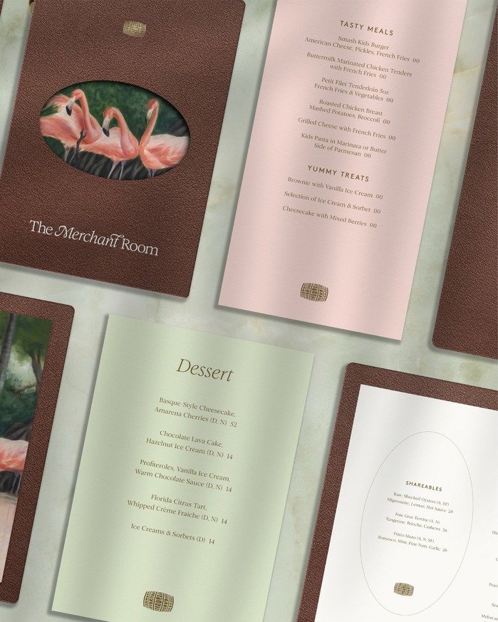 King & Partners developed the brand identity for Four Seasons Naples, built around the concept Impressions of Paradise, expressed through bespoke botanical illustrations and tactile design details. The Merchant Room is a refined New American Brasserie by two-time James Beard Award–winning chef Gavin Kaysen, inspired by the elegance of Old Florida. The Merchant Room branding is set in Romie Regular and Italic, designed by Margot Lévêque.