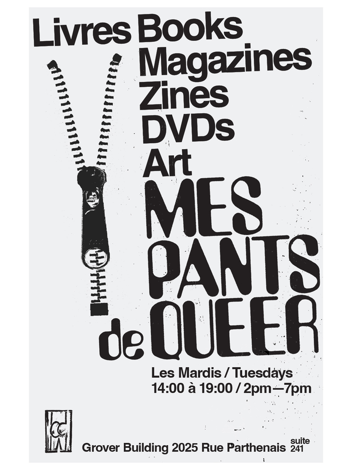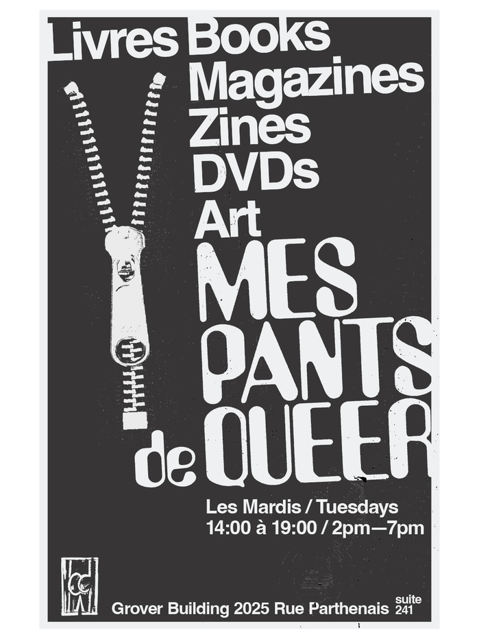 Promotional poster for Mes Pants de Queer, a thrift and self-publishing bookstore by, for and about LGBTQ2SAI+ communities in Montréal.