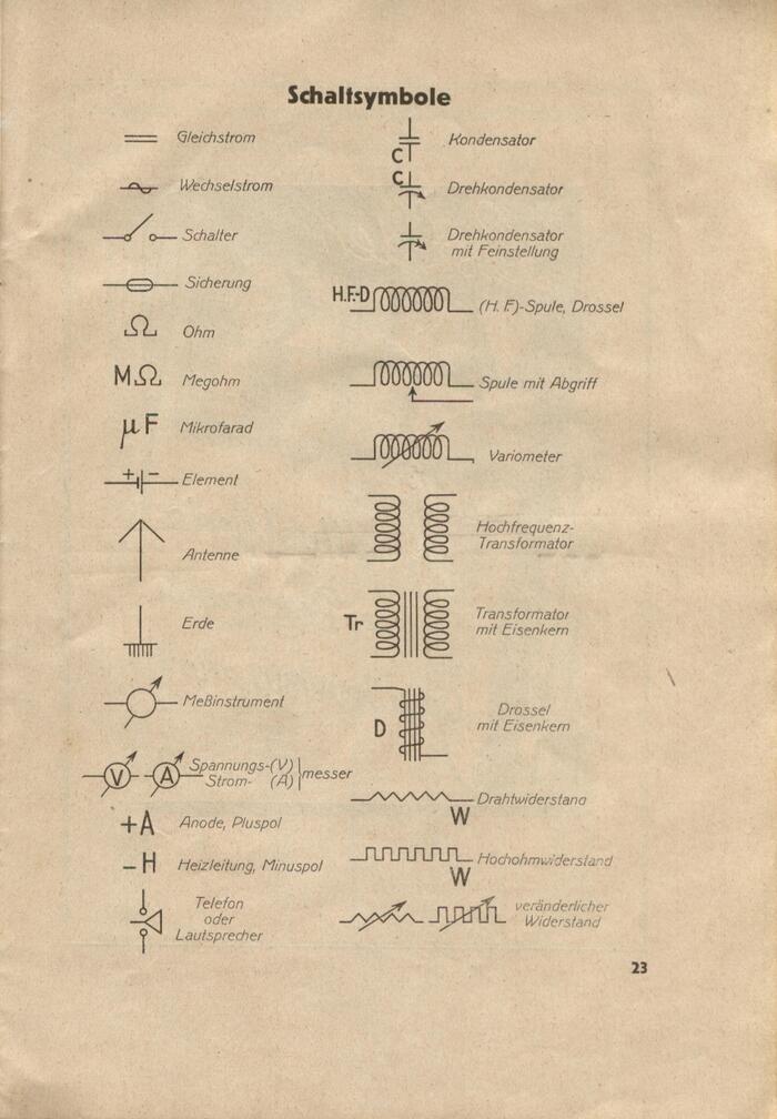 We get to see a range of period typefaces, all released by German foundries in the first third of the 20th century. The oldest one among them is Aviso, which appears for the labels on page 23, listing commonly used electrical circuit symbols. Aviso was first cast by Berthold in 1903. The monolinear italic might have been chosen for its similarity to DIN 16, the standard letterforms used in technical drawings. See the captions for more notes on the type.