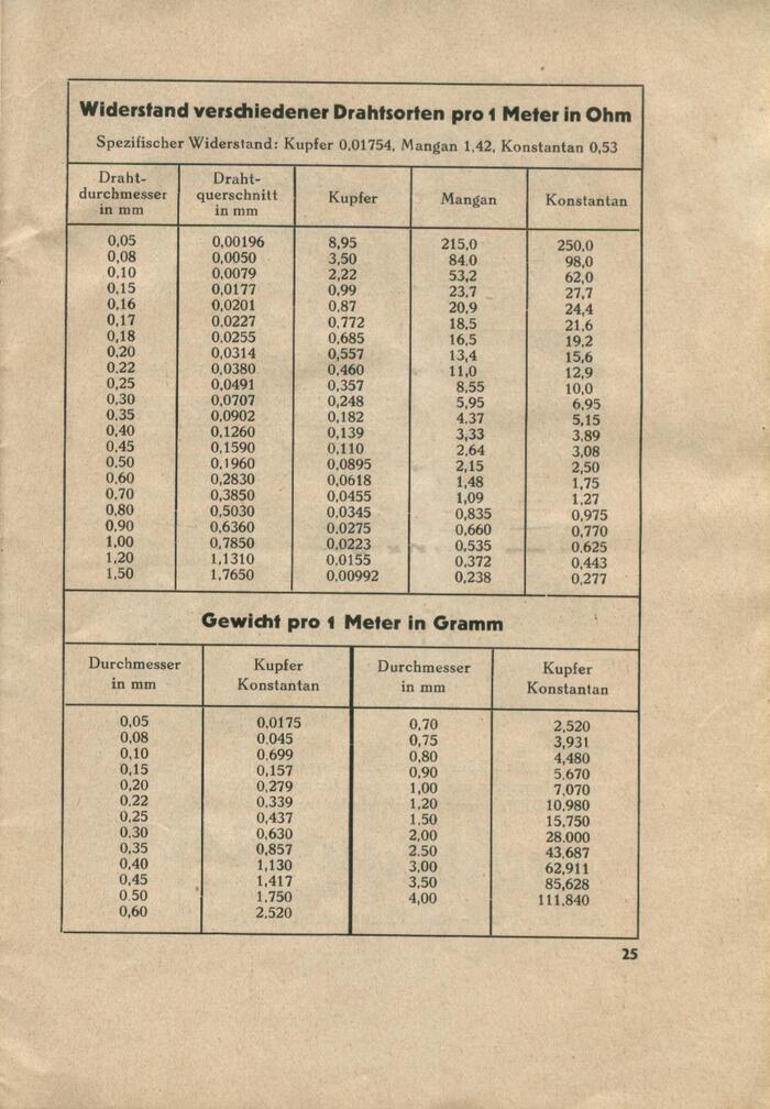Tables with values for the electrical resistance of various types of wire and the weight of one meter of wire