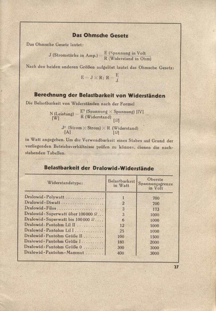 Ohm’s law and a formula for calculating the power handling capacity of resistors