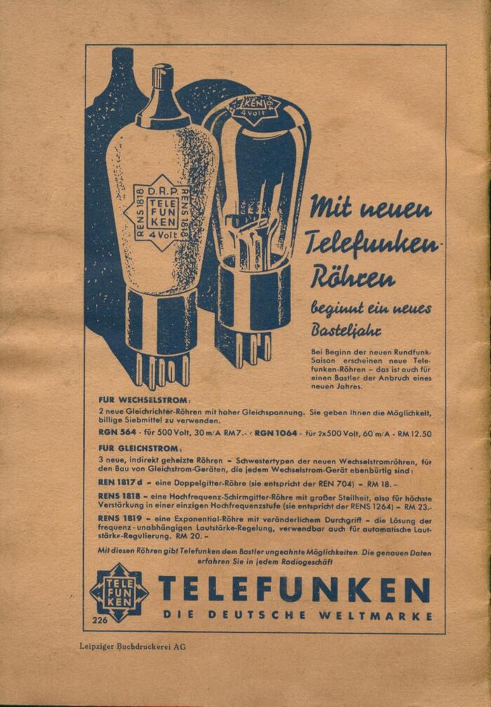 The Telefunken ad on the back cover uses Futura together with Signal. This script typeface was first cast by Berthold in 1931, making it the youngest one used in this booklet.