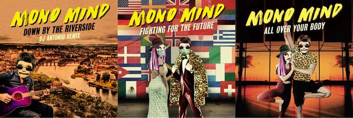 Cover art of the Mono Mind singles “Down by the Riverside”, “Fighting for the Future”, and “All Over Your Body”