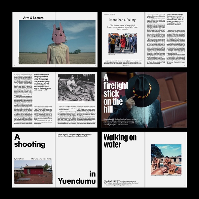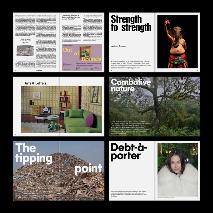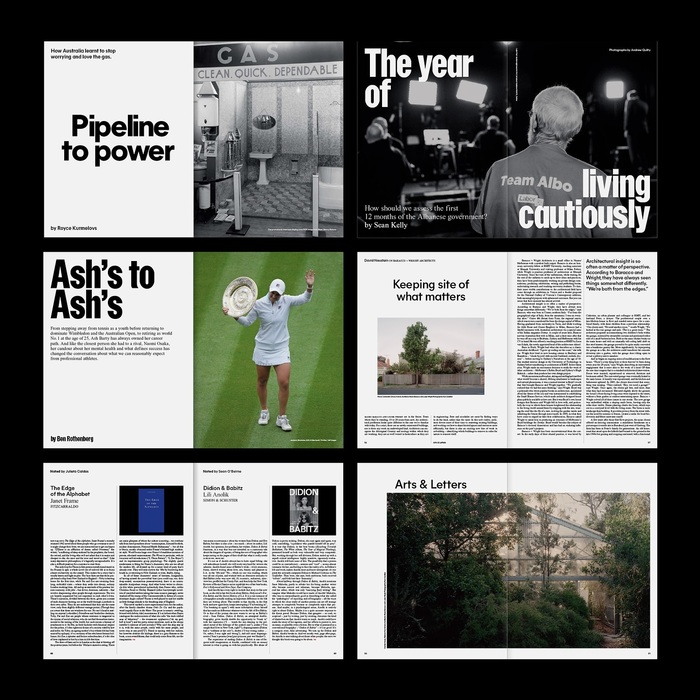 Giesser, known for a minimal and pragmatic design approach, reworked a publication he already admired. His goal was to create more space and contrast, making dense content more approachable without losing its intellectual rigor. With The Monthly’s feature essays often spanning 20,000 words, designing a layout that remained visually engaging was no small feat.
