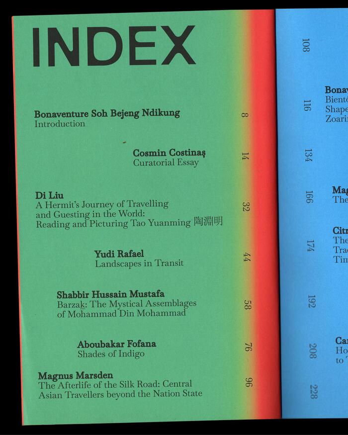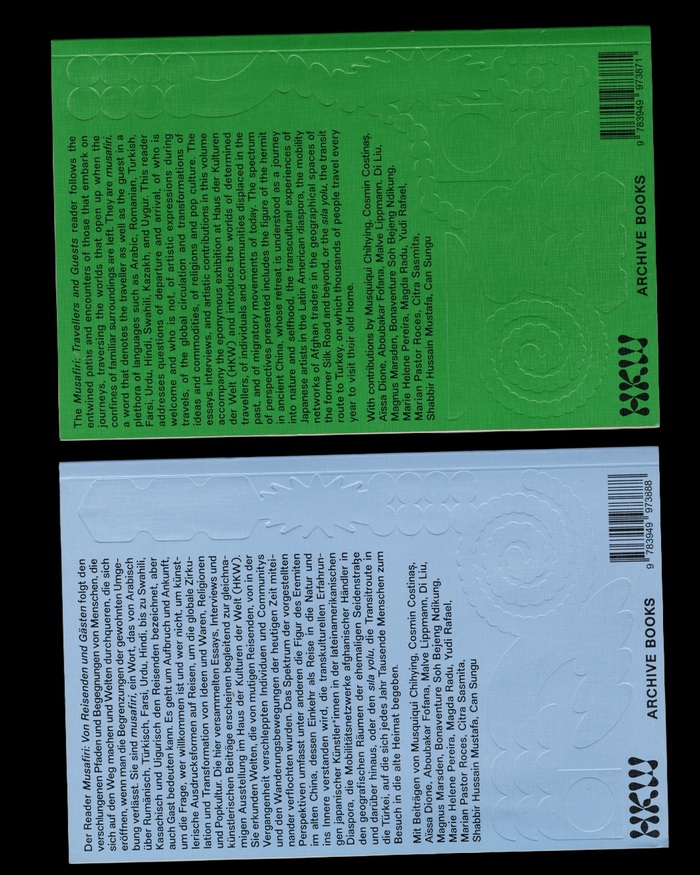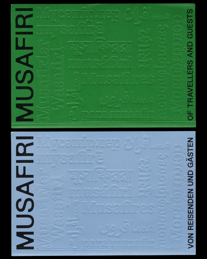 Musafiri. Of Travellers and Guests is a research project that culminated in an exhibition shown at Berlin’s Haus der Kulturen der Welt (HKW) from 8 March to 16 June 2025. The accompanying publication was designed by Uncoated using New Edge 666 and BBB Baskervvol. The covers additionally feature debossed text in various scripts, set in yet unidentified typefaces. From publisher Archive Books: