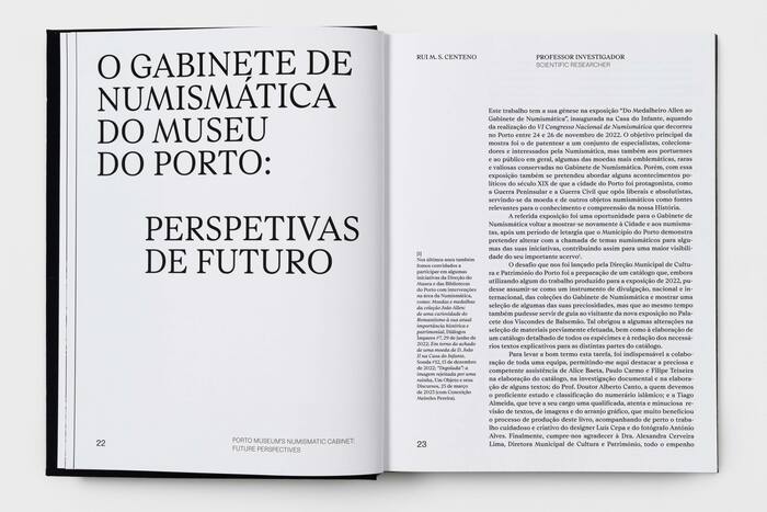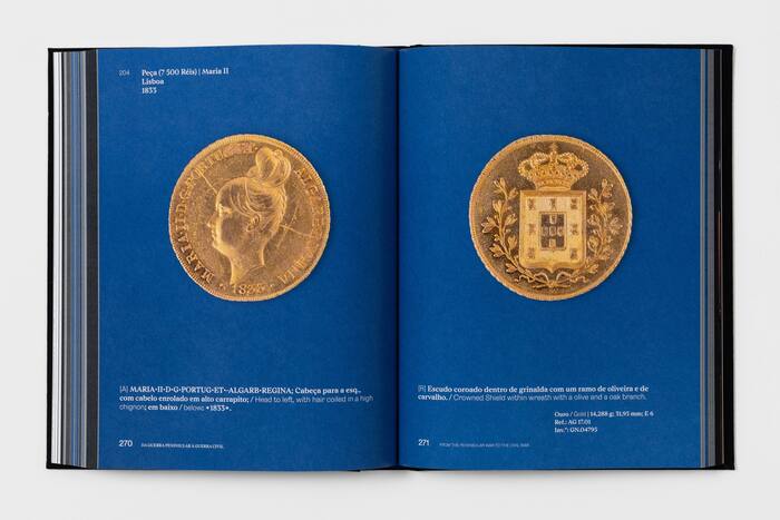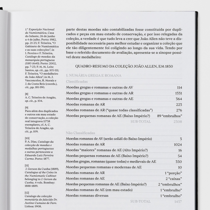 The book highlights over 300 sets of coins, medals, and banknotes, which form part of the collection acquired by the municipality in 1851 for the establishment of the Museu Municipal do Porto. The origins of this collection lie in the medal cabinet founded by João Francisco Allen (1781–1848) and these artifacts, spanning different periods of history, are presented chronologically (Ancient Greece, Roman, Iberian, Suevic, Visigothic, Arab, up to the emergence of the Portuguese monarchy).