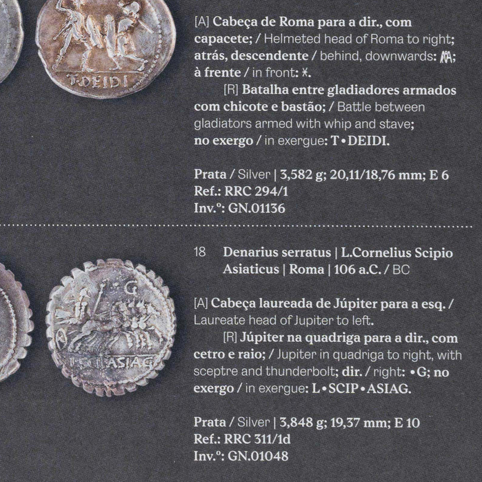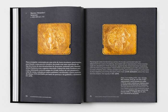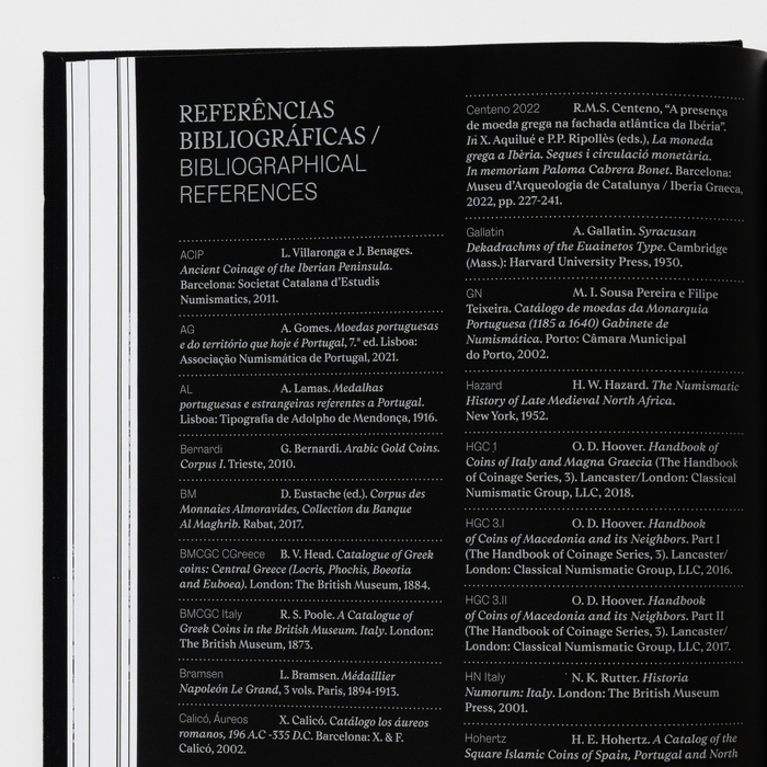 All objects have been photographed and displayed in carefully curated sets throughout the book, with visual scales of 8.5, 6, and 3.5 cm. Coloured backgrounds are used to enhance the texture and metallic composition of each coin. Each item is accompanied by introdutory cientific texts, key characteristics, and an exact transcription of its inscription.