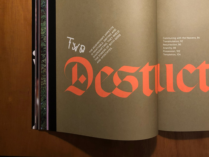 Exploring the topics of “creation, destruction, attraction, and revulsion”, each chapter is printed on a different paper and uses a different set of typefaces.