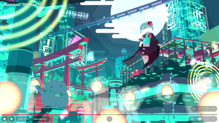 "朧月夜" ("Hazy Moon Night") is the third song by Japanese electronic music group Nanatsukaze, released on 7 July 2023 with video clip illustration by Mokao Okamoto. The video clip illustration is cyberpunk-themed but Japanese lyrics use the retro-styled (1930s Showa Era) Japanese geometric typeface Makinas by Moji-Waku Research.
