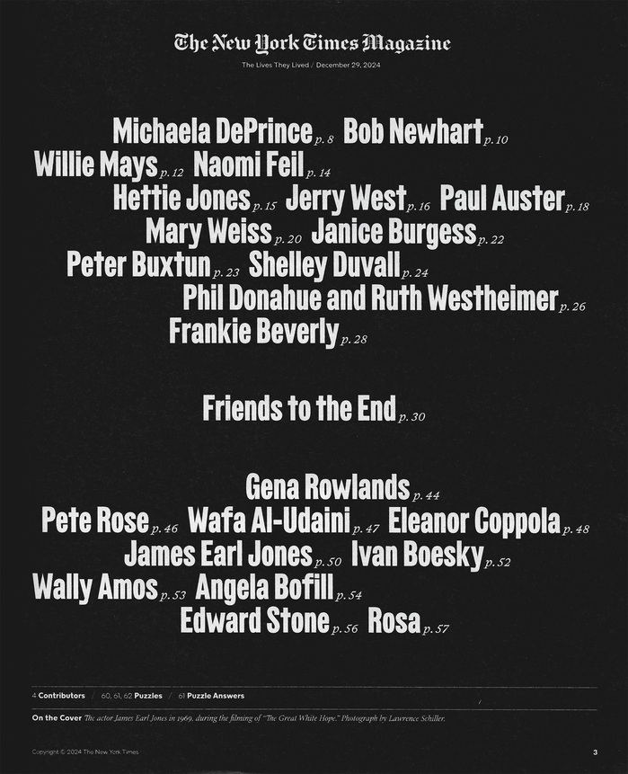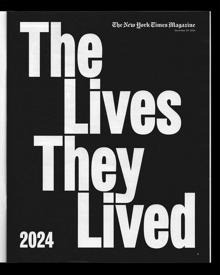 “The Lives They Lived” is an annual special issue of the New York Times Magazine, published at the end of each year. The edition honors notable artists, innovators, and thinkers who died during the previous twelve months.