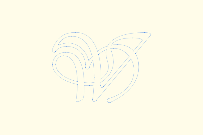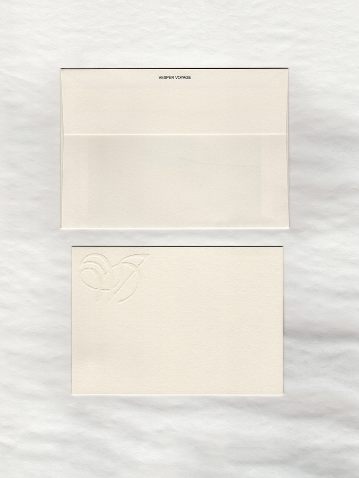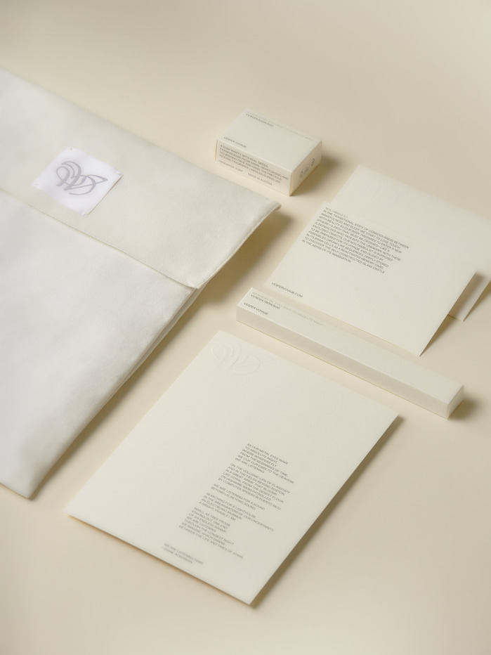 The logotype and all printed assets are set in all-caps Modern Gothic. The signet is a bespoke reinterpretation of the lowercase v from Magnificat, originally sourced from a Letraset sheet, intended to function as the brand’s double-v initials. It is deployed consistently across the identity: embossed on envelopes and cards, and integrated into the labeling system.