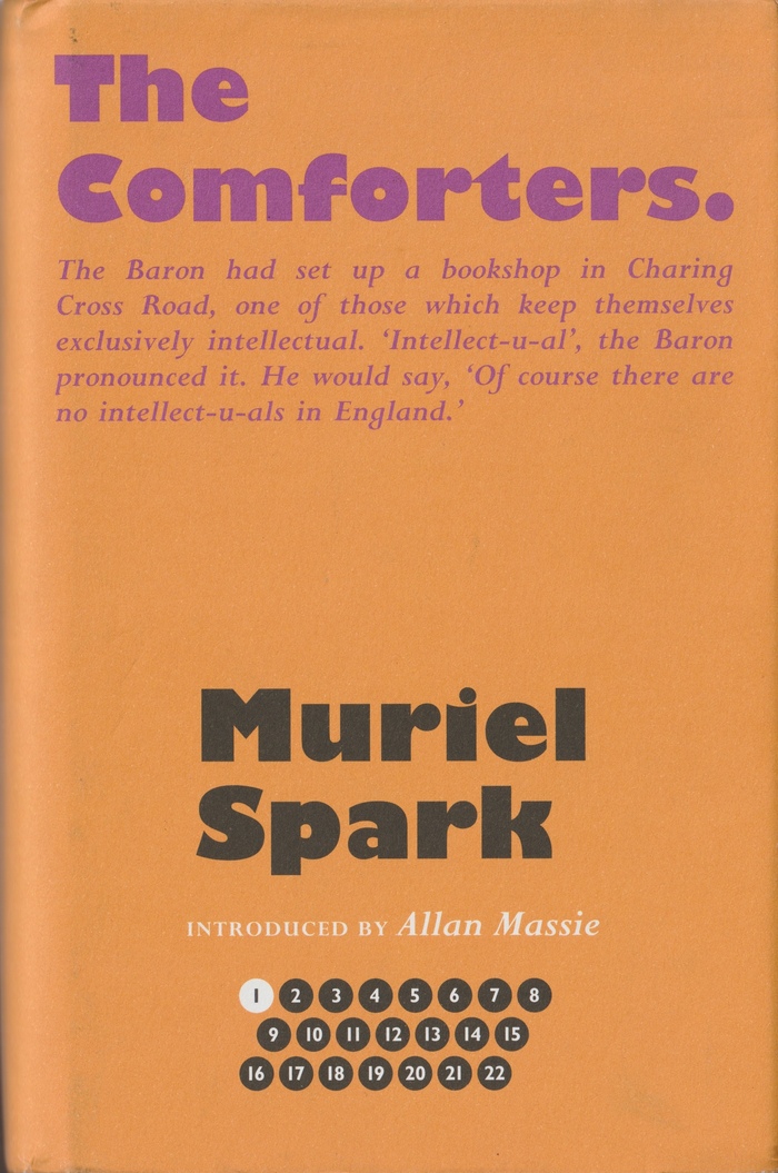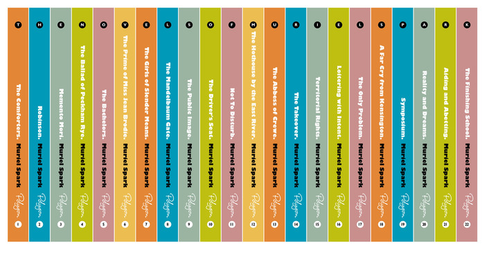 The sequence numbers are repeated at the bottom of each jacket spine, as well as a single, similarly highlighted single letter at the top. When all the books are assembled in order on a shelf, the highlighted letters spell out ‘THE NOVELS OF MURIEL SPARK’ — a clever ‘Easter egg’!