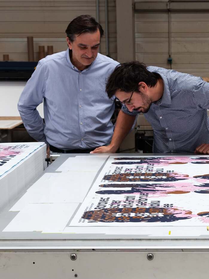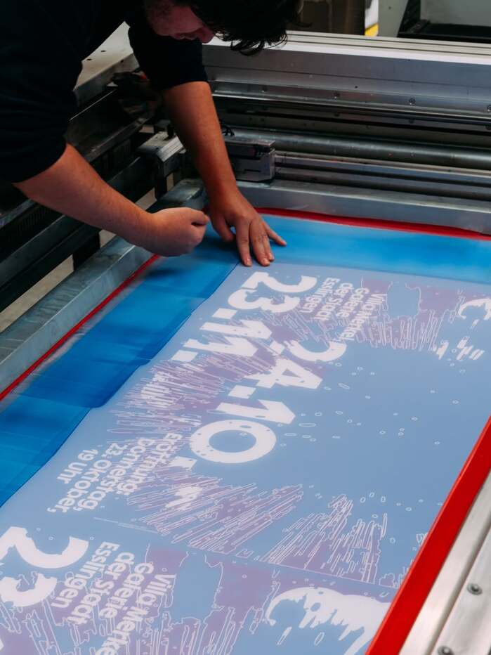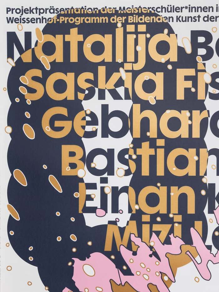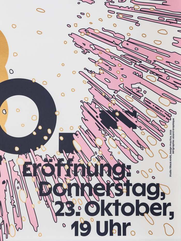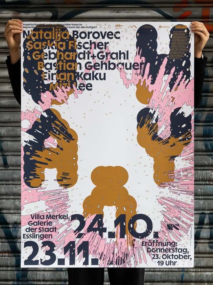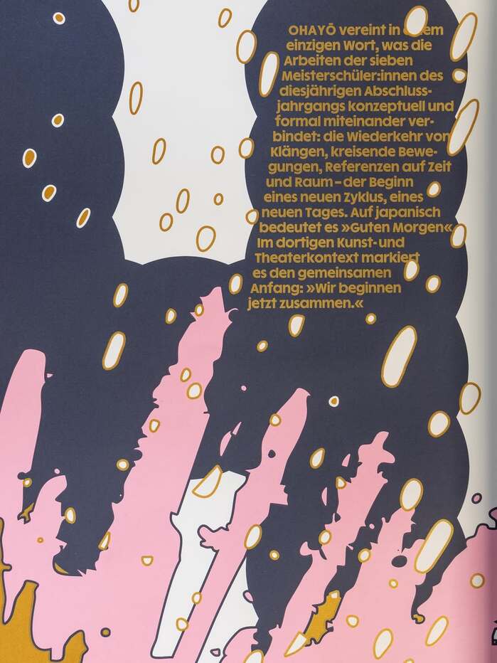 Poster for OHAYŌ, the project presentation of the Master’s students from the Weissenhof Fine Arts program at the ABK Stuttgart, shown from 24 October to 23 November 2025 at Villa Merkel, Esslingen. The poster was designed by the team of Studio Tillack Knöll (consisting of Sven Tillack, Steffen Knöll and Zevako Maryna). It’s a three-color silkscreen print on DIN A0 paper, flawlessly executed by Lézard Graphique.