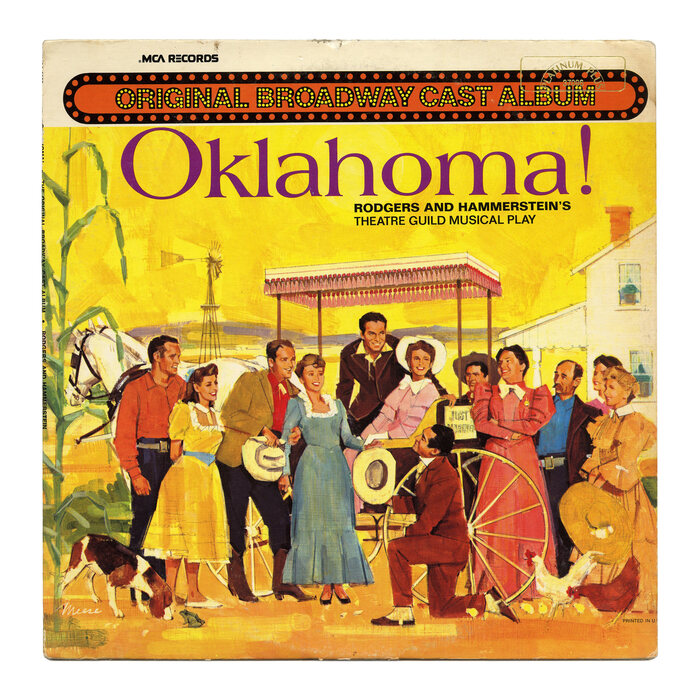 This album with “selections from the Theater Guild musical play […] featuring members of the original New York production” recorded 20 and 25 October was first released by Decca in 1943. The 25th anniversary edition from 1968 introduced a new cover design, featuring an illustration by James Alfred Meese and Americana and Folio for the typography. The line at the top – with extrabold caps from Helvetica filled with “lightbulbs” – was added for a 1973 issue, now by MCA Records. The shown copy is from 1980, with unchanged design, apart from the “Platinum Plus” seal at the top right.