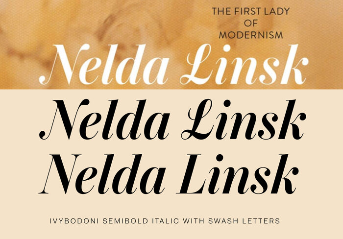 This image shows the name of the cover (top) compared to a resetting in IvyBodoni Semibold Italic with swash letters (center). For reference, the typeface is shown with standard caps below.