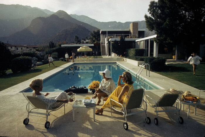 This photo is titled Poolside Gossip, with Nelda Linsk in yellow. It was taken by Slim Aarons, showing the modernistic Kaufmann Desert House designed by Richard Neutra.