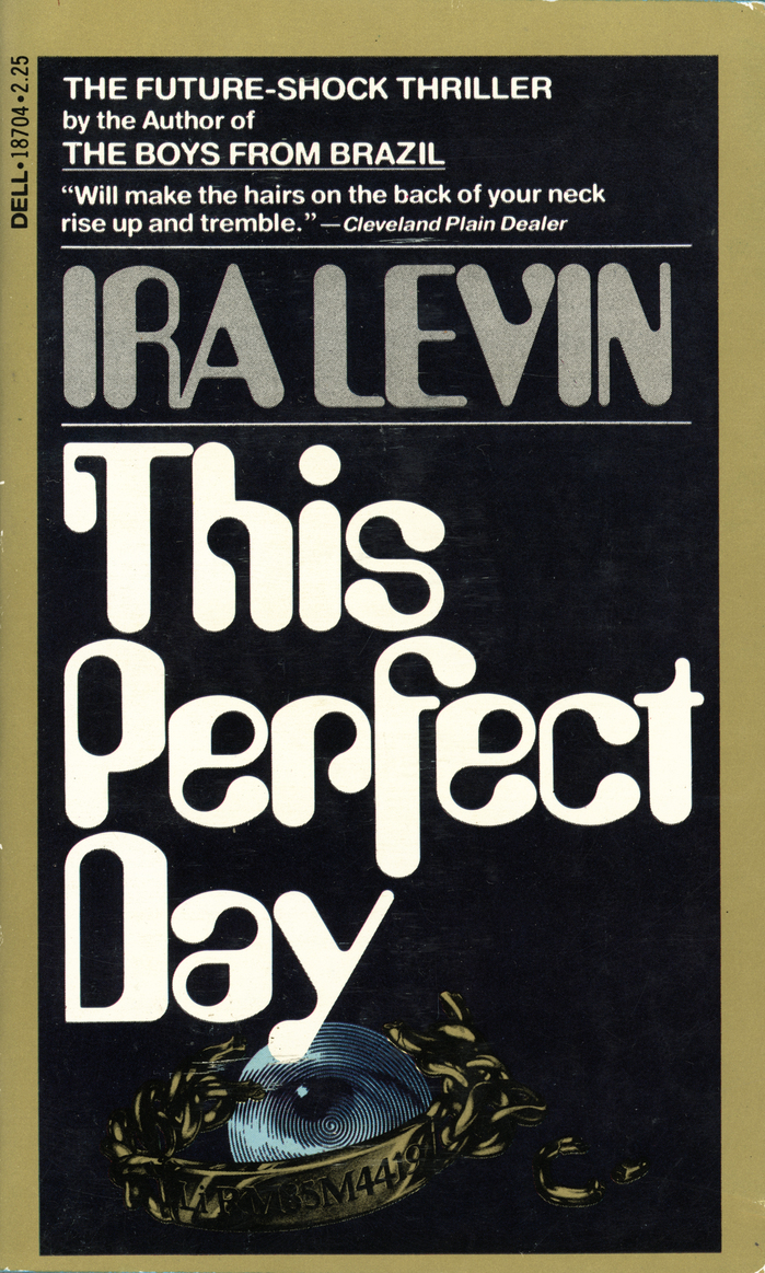 This Perfect Day is the third novel by Ira Levin (1929–2007), following the Edgar Award winning A Kiss Before Dying (1953), the international bestseller Rosemary’s Baby (1967), and – as mentioned on the cover – the thriller novel The Boys from Brazil (1976). First published by Random House in 1970 with a jacket design by Paul Bacon, this is Dell’s 1979 paperback edition of this classic science fiction novel about a technocratic dystopia. Cover artist unknown.
