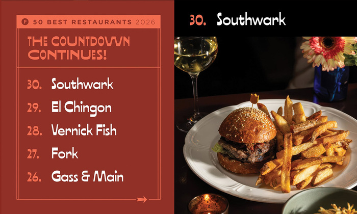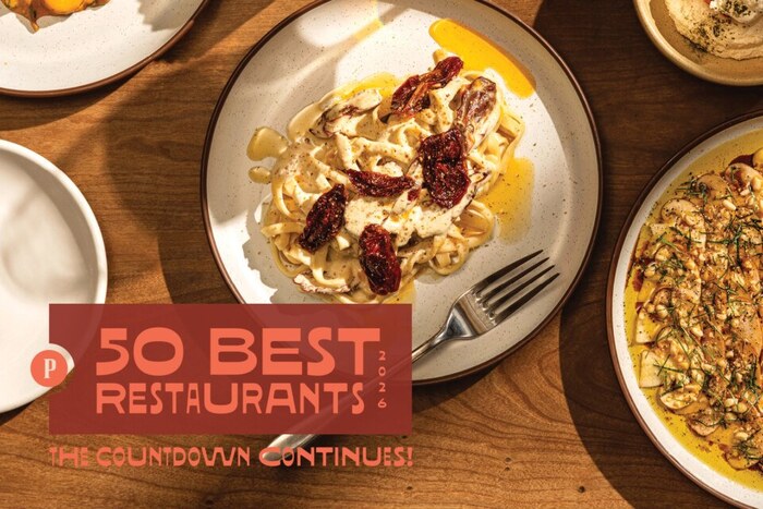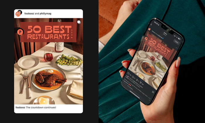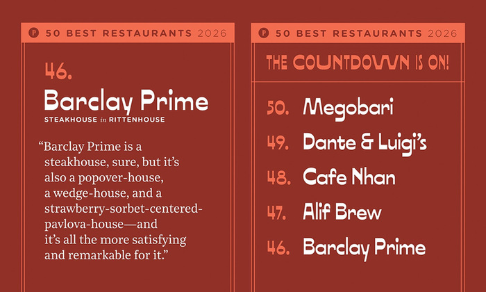 Source: www.instagram.com Philadelphia Magazine. License: All Rights Reserved. Sundose is used for the title and the list of restaurants. The quote is in Noe Text and “50 Best Restaurants 2026” in all-caps Gotham Rounded.