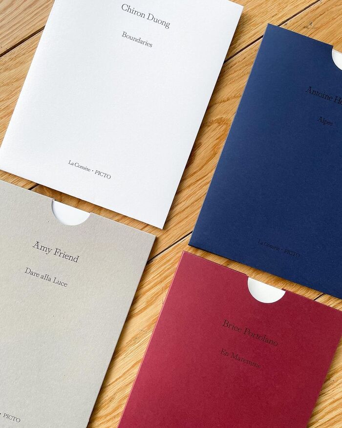 A limited-edition series of mini-portfolios bringing together fine art photographs, created by the La Comète bookshop and produced with the printing expertise of Picto laboratories. Each portfolio is developed in close collaboration with photographers whose work stands out for its singular vision. Featuring the work of Eloïse Labarbe-Lafon, Amy Querin, Antoine Henault, Chiron Duong, and Brice Portolano. Using Solæ typeface on the covers.