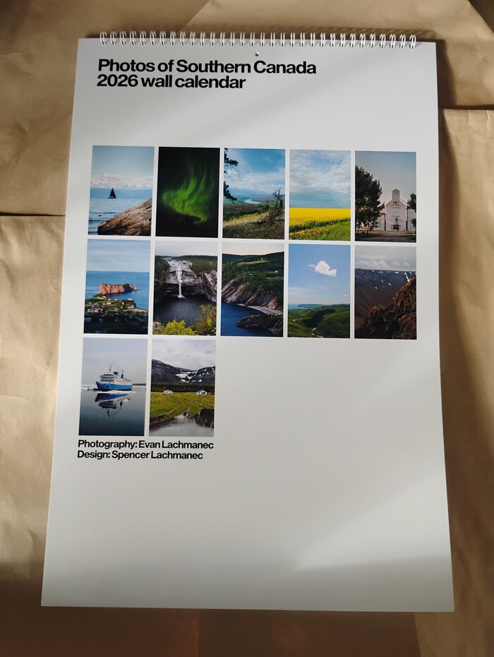 Photos of Southern Canada is a 2026 wall calendar featuring photography that my brother, Evan Lachmanec, shot on a cross-Canada road trip some years ago.