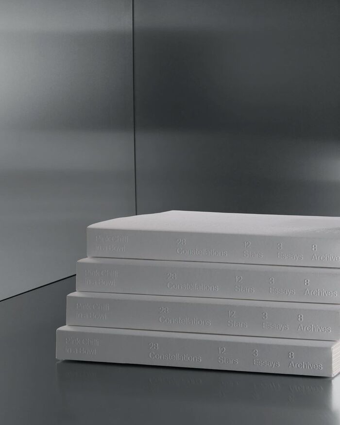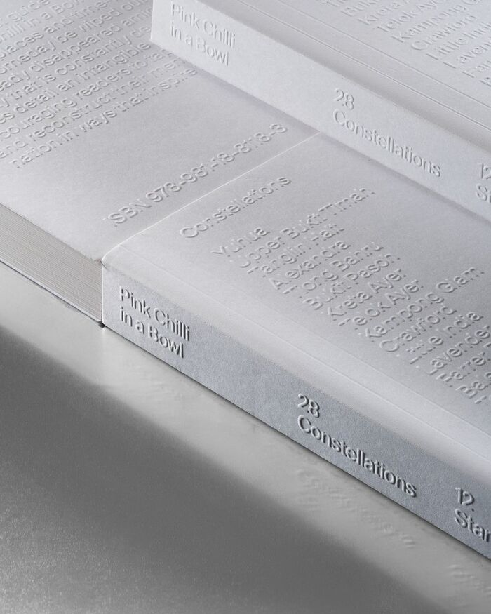 This tension is mirrored in its grid-based design, juxtaposed with varying paper stocks, including translucent pages that engage with light and space through reverse printing. Subtle lines further demarcate the grid, forming tangible “stars” that interconnect throughout.