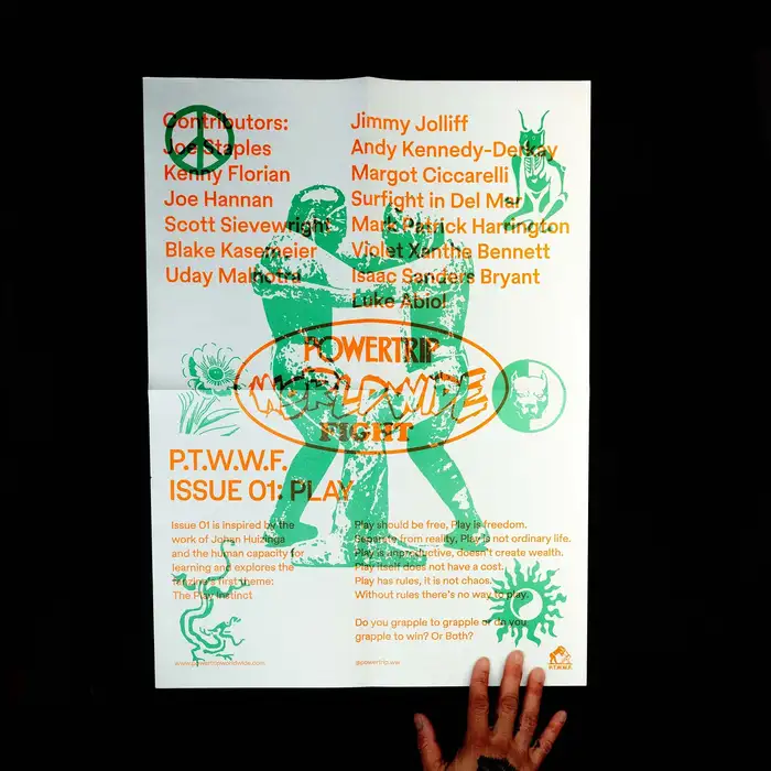 The first issue of Powertrip Worldwide, “Play”, is dedicated to the worlds of jiu-jitsu, judo, and wrestling. Through striking visuals, in-depth stories, and a raw, unfiltered perspective, the fanzine explores the culture, history, and techniques of grappling. Inside the Riso printed pages you can expect a mix of insightful interviews, personal accounts, and bold design that captures the spirit of combat sports. This inaugural issue explores play as a mode and motivation for our training. It is limited to 335 copies in its original colorway and comes with a large poster.