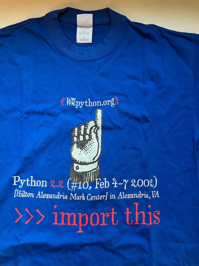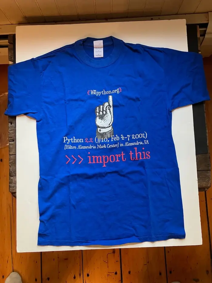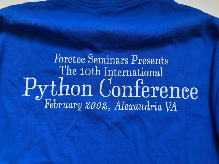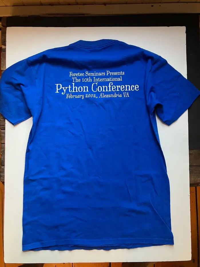 This unworn T-Shirt from the Python Conference 2002 – before it was called PyCon – is currently available on eBay. In my opinion, the design (presumably by Erik van Blokland) perfectly embodies the whimsical spirit of Python.