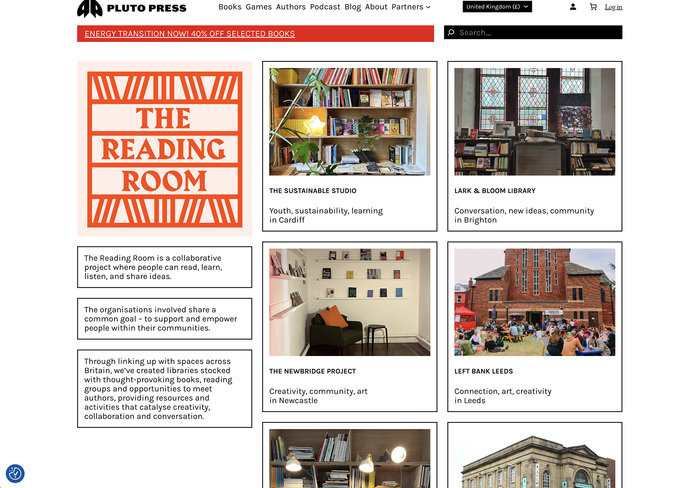 The initiative exists as a physical space in various locations across the UK, and hosts events like reading groups, workshops, and author talks.