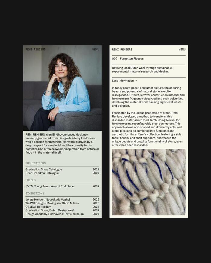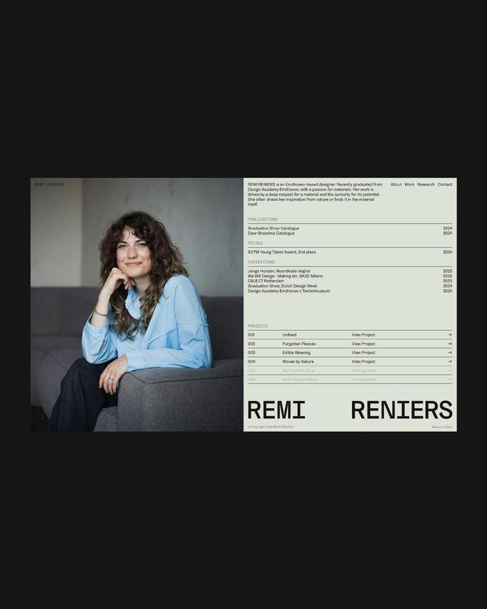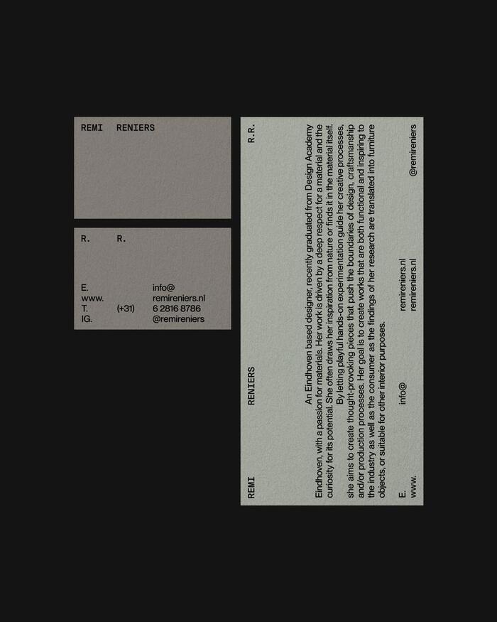 Other Studio partnered with Eindhoven-based designer Remi Reniers to create a new visual identity and website that reflect her deep respect for materials and the natural environment. Her practice is driven by curiosity, shaped by process, and rooted in the raw potential of nature’s rediscovered forms.