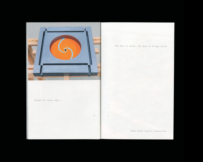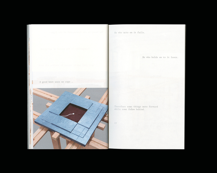 Text is set in WT Garamono, a monospace take on the classical Garamond style that allows the poetic phrases to dance and shift across the page in a structured way, weaving between shuffled imagery from both exhibitions, and layering on top of each other through the lightly transparent paper.