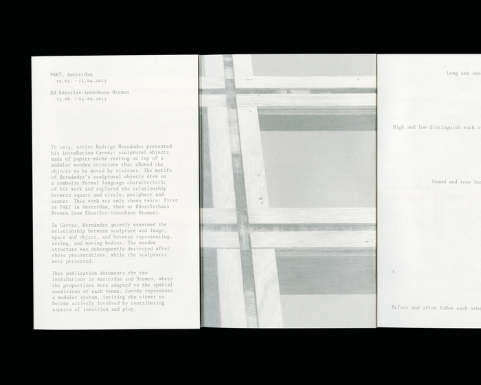 accompanies two exhibitions of Rodrigo Hernández’s modular structural artwork, on which colourful, silver mounted plates can be moved by visitors along a wooden frame. Exploring the relationship between sculpture and image, space and object, stillness and movement. Positioned in different configurations at Künstler:innenhaus Bremen and P/////AKT, Amsterdam, the imagery is shuffled to not distinguish between each iteration.