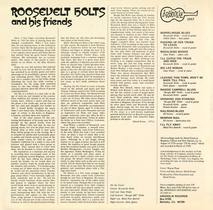 Arhoolie Records released this blues compilation in 1972, with songs by Roosevelt Holts and his friends, namely Boogie Bill Webb, Eli Owens, Blind Pete Burrell, and Esau Weary. Of the eleven tracks, all but one were recorded August 1970, in Bogalusa, Clifton, and New Orleans.