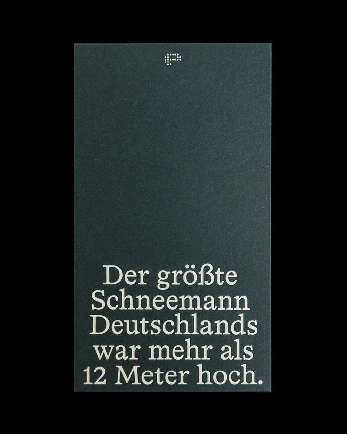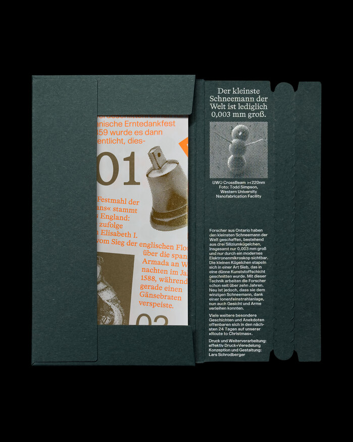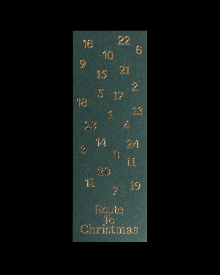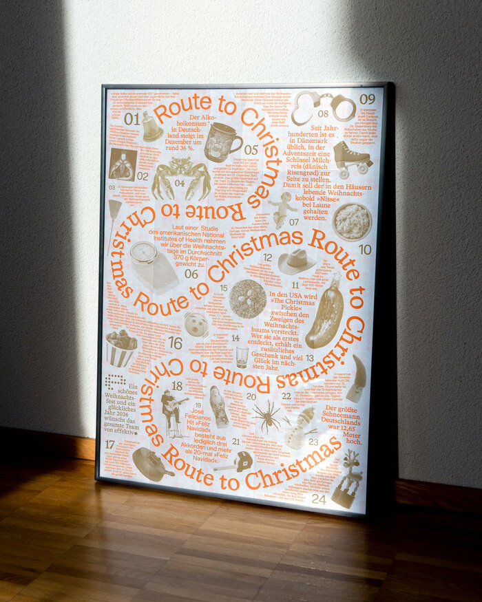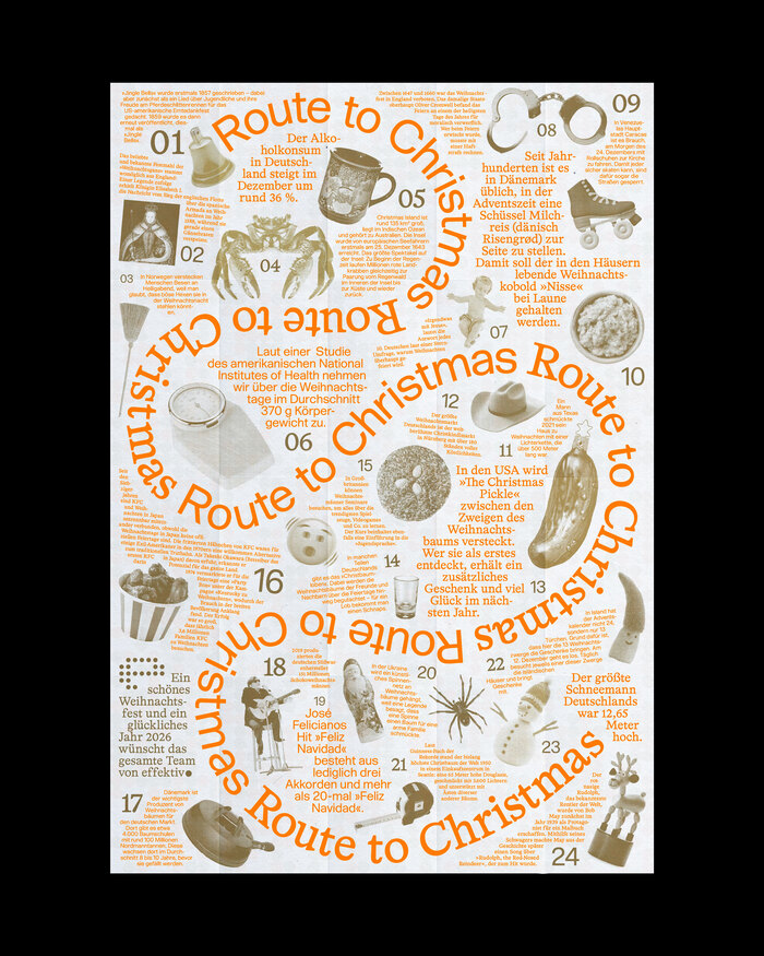 “Route To Christmas” is a folded poster (55×80 cm) designed by Lars Schrodberger für effektiv Druck+Veredelung. The print, packaging and paper finishing company in Fürth also produced the product to market their craft and services. The poster acts as a calendar leading up to Christmas eve with 24 entertaining facts about the holidays. On the reverse side it also functions as gift wrapping paper, printed in two spot colours on Soporset Premium Offset 80 g/m² paper and finished with gold hot foil stamping. The outer folder is produced with Gmund Used 8 300 g/m² and stamped with white foil. It is typeset in HAL Timezone by HAL Typefaces and KTF Forma by Kyiv Type Foundry.