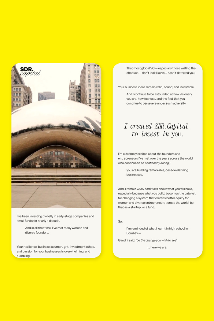 SDR Capital, named after the initials of founder Shefali Roy, is a London-based family office investing in finance, technology, and AI. The brand identity uses typography to express a practice grounded in conviction, precision, and a deliberate refusal to follow convention. The visual language, spanning identity and a pared-back single-page website, is built for a firm that moves through capital on its own terms.