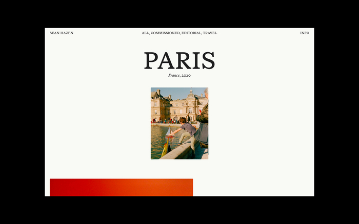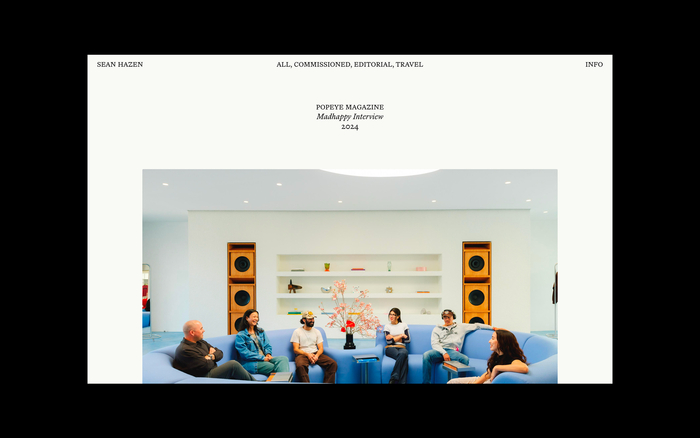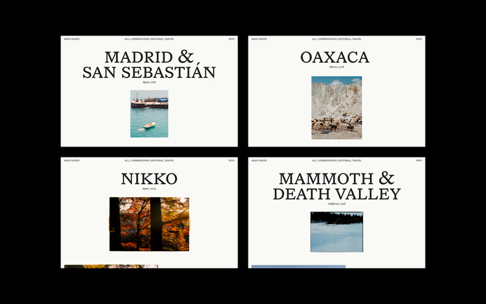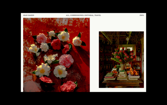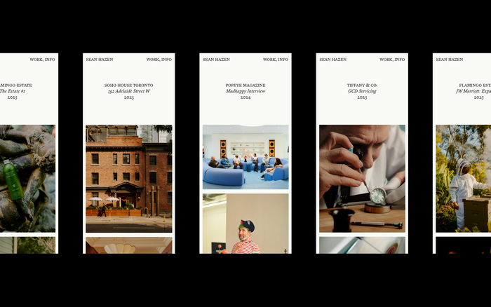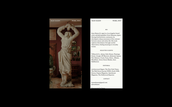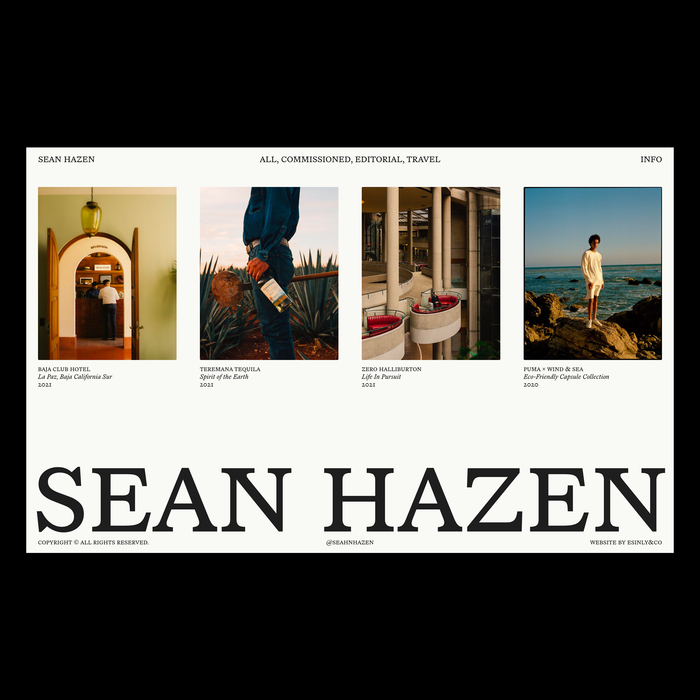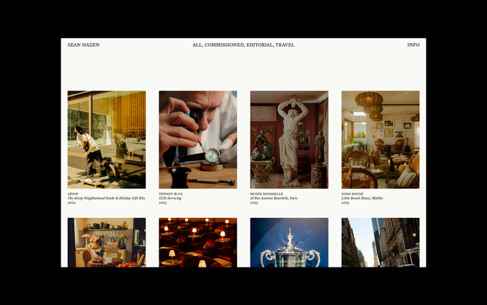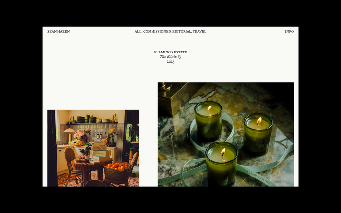 Esinly&Co designed Sean’s portfolio website to showcase projects for clients including Flamingo Estate, Tiffany & Co., and Aesop. The design prioritizes generous white space and refined typography, allowing the photography to take center stage.