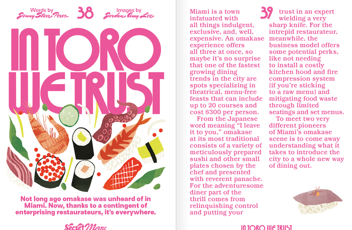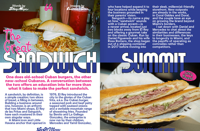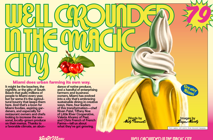 The design team for this project included Sebastien Millot, Michelle Phillips, and Kir Nazarov, with production by Mike Teevee. David Amsden and Erin Ruffin are the editors-in-chief of the magazine. According to Phillips, “for the Miami Issue for Secret Menu, we wanted to bring the instantly recognisable world of Iconic Miami’s Mimo and Art Deco style together with its lax small-town scrappiness by combining a geometric sans (Megascope), with a brush script (Ed’s Market) to really bring out Miami’s almighty food culture scene.”