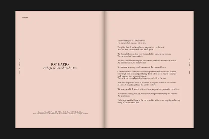 Since issue no. 39 (fall 2025), the typography pairs Store Norske Gangster from Skriftkompani with ABC Monument Grotesk from Dinamo, combining a literary, editorial feel with a sturdier grotesque for headings and navigational elements.